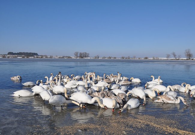 Птахи прилетіли сюди ще восени і, певно, відлетять навесні, коли потепліє. Адже влітку останніх років десять, кажуть, тут постійно гніздиться пара білосніжних лебедів і більше нікого з лебединої родини сюди в цю пору не допускає.