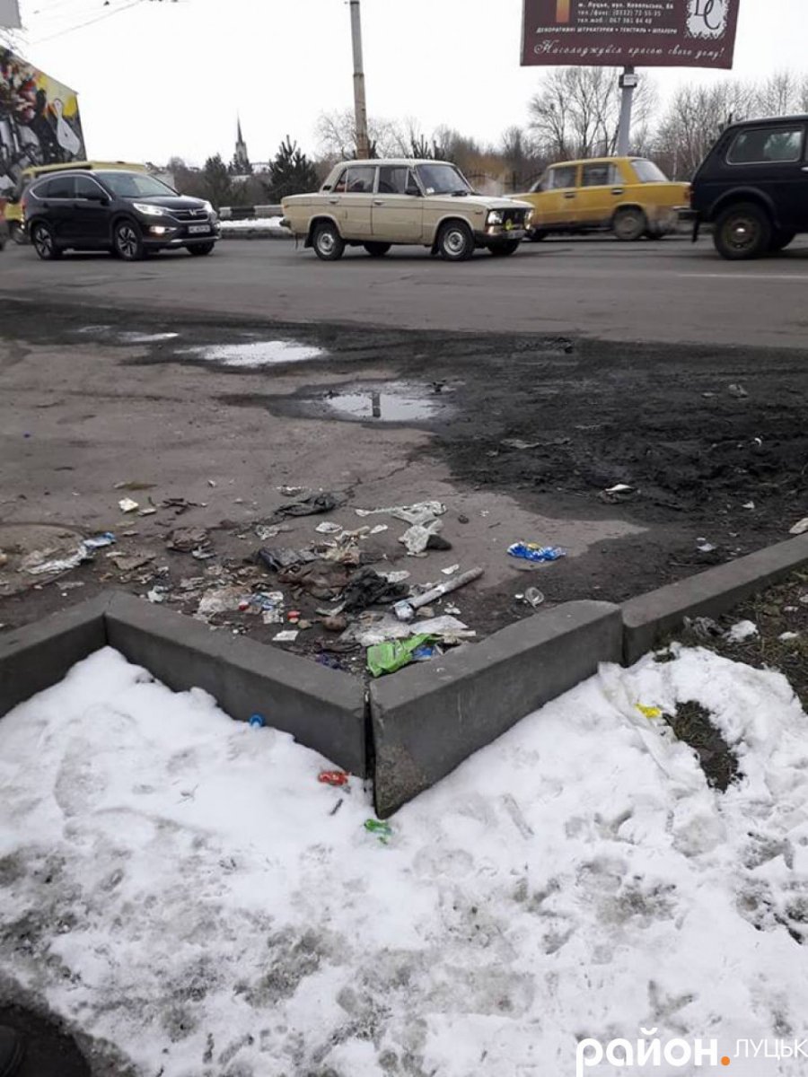 Узбіччя дороги на вулиці Набережній у Луцьку практично встелені сміттям та відходами.