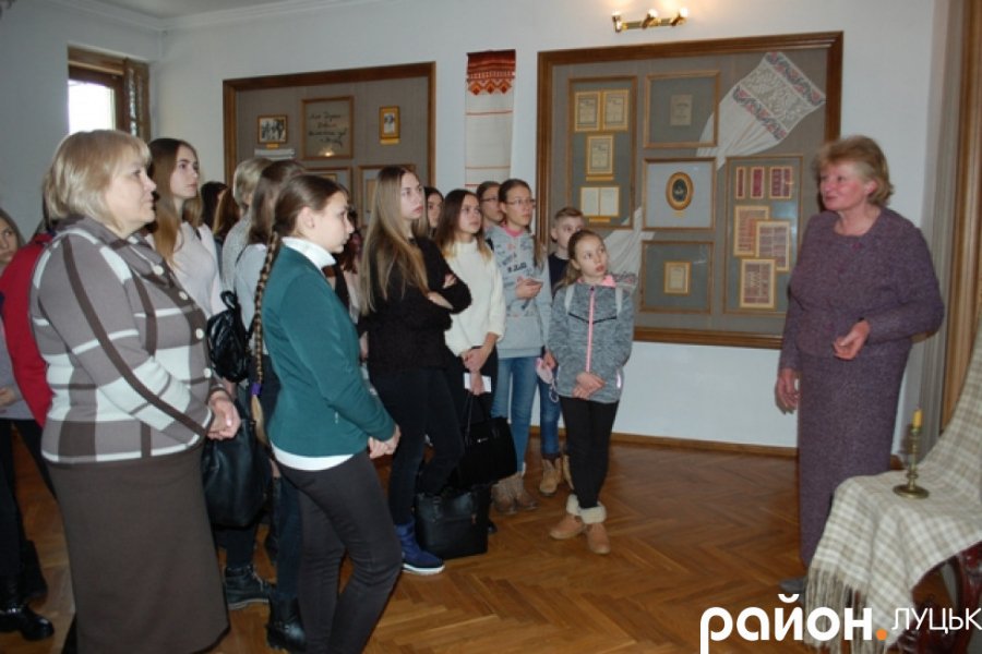 Мержвинська розповіла школярам, що в музеї зберігається багато дорогоцінних реліквій – речей, які належали Лесі Українці: особиста ручка та ніж для розрізання паперу, який виготовили зі слонової кістки, підсвічник, стіл, стільчики, вазу, яку Леся привезла з Італії, тарілочки, ложка для соусу та ін. Окрім того, багато речей показала в меморіальних будиночках родини Косачів.