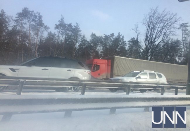 На в'їзді до Києва, на Бориспільській трасі, утворився кілометровий затор. Заблоковані чотири смуги руху.