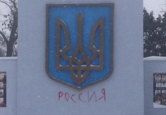 У Херсоні вандали намалювали червоною фарбою на стендах меморіалу Героям Небесної сотні свастику, а під зображенням герба України зробили напис «Росія».