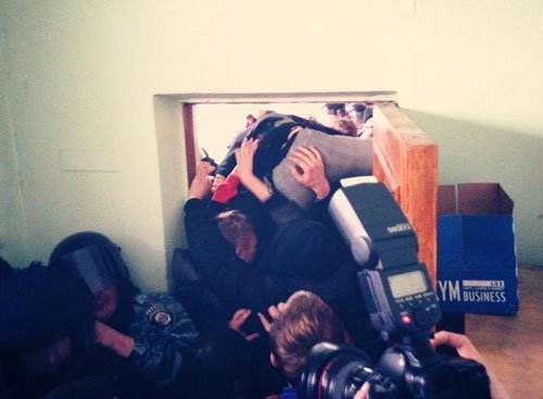 Мовляв, свободівці намагалась прорватися на засідання Громадської ради через головний вхід, але у будівлю Головпоштамту, де проходить засідання, нікого не пускали. Такі дії пояснили тим, що будівля нібито замінована. "Свобода" прорвалась через боковий вхід. Бійка була весь час. Між "Свободою" і "Беркутом". "Беркут" відібрав у фотокора-дівчини камеру, виштовхав її з зали. Камеру віддавати відмовлялись. А друга дівчина-журналіст тричі намагалася потрапити до зали вже по головах "Беркута", - цитує Лебедєва Тишковця.