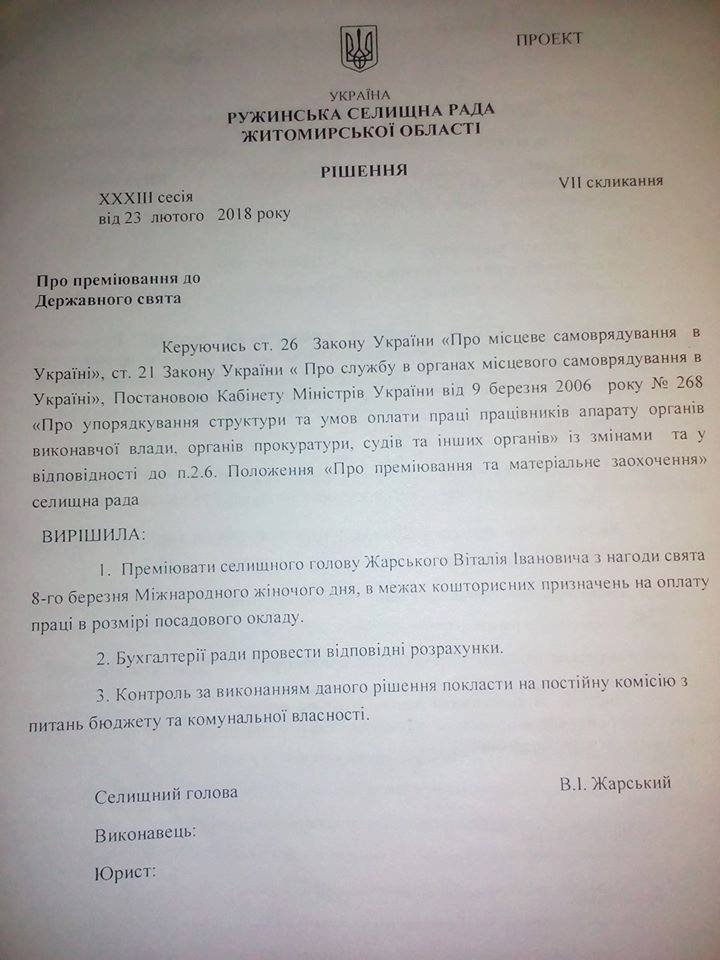 На Житомирщині голова однієї селищної ради Віталій Жарський преміював себе з нагоди Міжнародного жіночого дня.