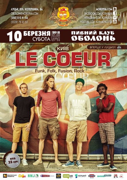 Що обіцяють: Вперше в Луцьку представники нового стилю «c`Kor» - «Le Cœur» (з французької - серце) - Гурт, який об'єднав в собі музикантів з п'яти країн - Конго, Мексики, Ірану, України і Еквадору, тому її музика має певний шарм, а пісні звучать багатьма мовами: англійською, іспанською, французькою, українською, лингала і суахілі.