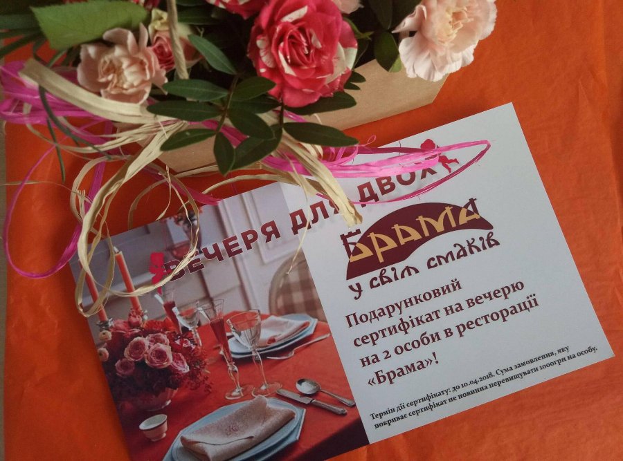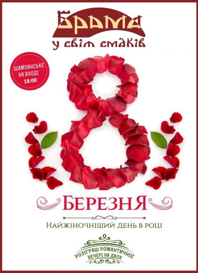 Усіх дам ресторація «Брама» безкоштовно пригостять бокалом ігристого та подарує квіти. Окрім того, гості мають нагоду взяти участь у розіграші. Для цього 8 та 9 березня необхідно буде заповнити анкету. Переможців оголосять 10 березня о 18 годині. Щасливці отримають романтичну вечерю на двох. Присутність на розіграші – обов’язкова.