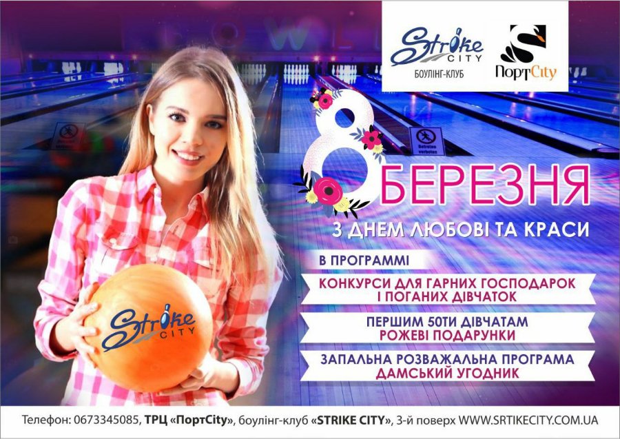 Для любителів активного відпочинку з 7 по 10 березня з 20:00 у StrikeCity цікава розважальна програма. Для жінок – спеціальні пропозиції та конкурси. А саме 8 березня з 20 години – неймовірне свято з подарунками та розважальною програмою.