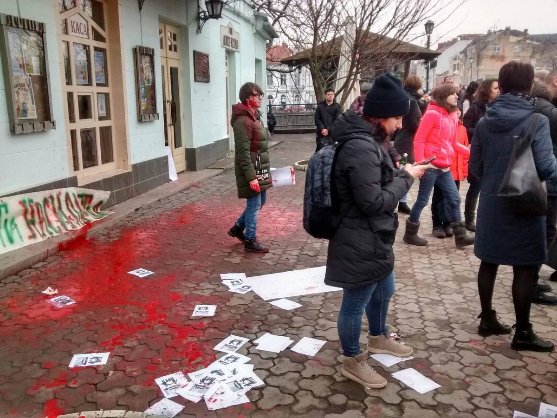 "В Ужгороді таки зірвали акцію на 8 березня. Дівчат облили фарбою. Поліція затримала близько 7 атакуючих, серед них було і кілька дівчат. Як помітили присутні, одна з дівчат є прес-секретаркою Карпатської Січі", - пише Ярина Денисюк.