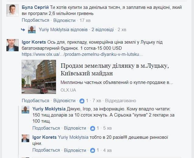 «Ти хотів купити за декілька тисяч, а я заплатив на аукціоні, який ви програли, 2,6 мільйони гривень», - йшлося в коментарі.