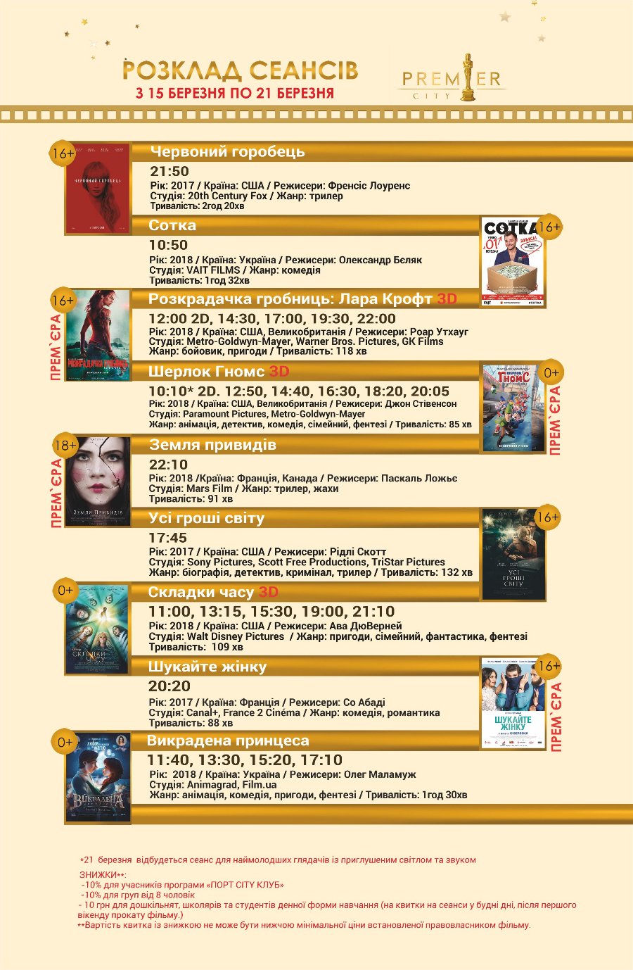 Один з найочікуваніших фільмів березня – «Розкрадачка гробниць: Лара Крофт». Фентезійний бойовик потішить поціновувачів жанру новою зустріччю з безстрашною дівчиною-археологом. У фільмі Лара Крофт відправляється в свою першу експедицію, щоб завершити розпочате батьком археологічне дослідження і розкрити античні секрети, які в свою чергу допоможуть очистити її ім'я. Їй належить боротися за виживання на схибленому від культу острові, застосовуючи всю свою вправність, силу і зброю.