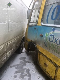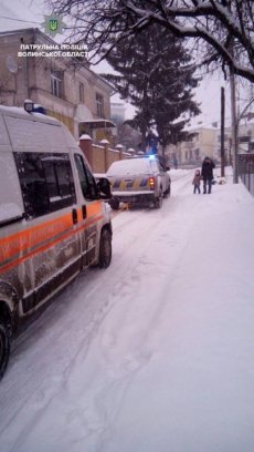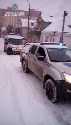 На вулиці Богдана Хмельницького правоохоронці на службовому автомобілі надали допомогу водіям швидкої та мікроавтобуса, які пробуксовували, бо не могли виїхати під гірку.