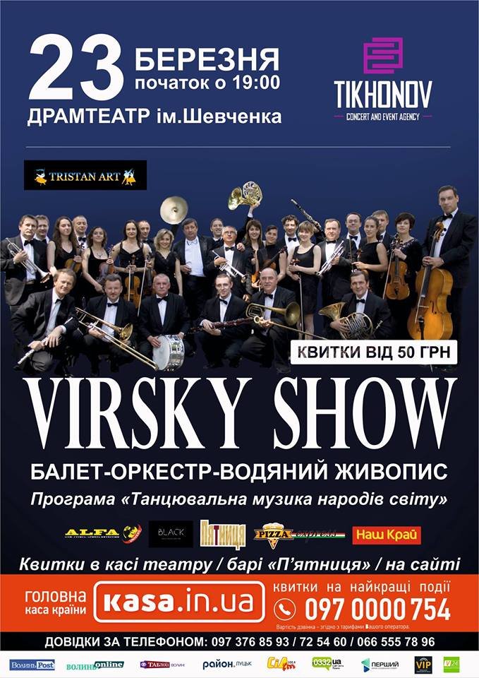 Що обіцяють: VIRSKY SHOW – це дійство міжнародної якості та формату. На одній сцені Ви побачите національний заслужений академічний ансамбль танцю України імені Павла Вірського разом з живописом на воді від всесвітньовідомої Ангеліни Золотої.