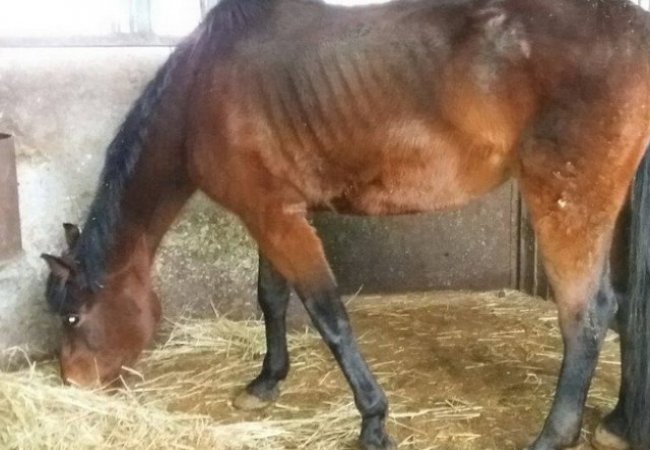 Коня Хоруга привезли в стайню до іншого кінно-спортивного клубу з попередньої домівки на реабілітацію. Про коня власник нової домівки тварини Олег Остріков дізнався з соцмереж. Там, де кінь раніше жив, залишились інші. Їхні фото поширили волонтери, де видно, що у тварин від голоду стирчать ребра.