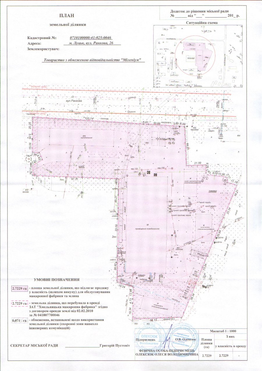 «Міленіуму» продали землю несільськогосподарського призначення комунальної власності вулиці Ранковій, 26, площею 2,7229 га для обслуговування макаронної фабрики та млина.