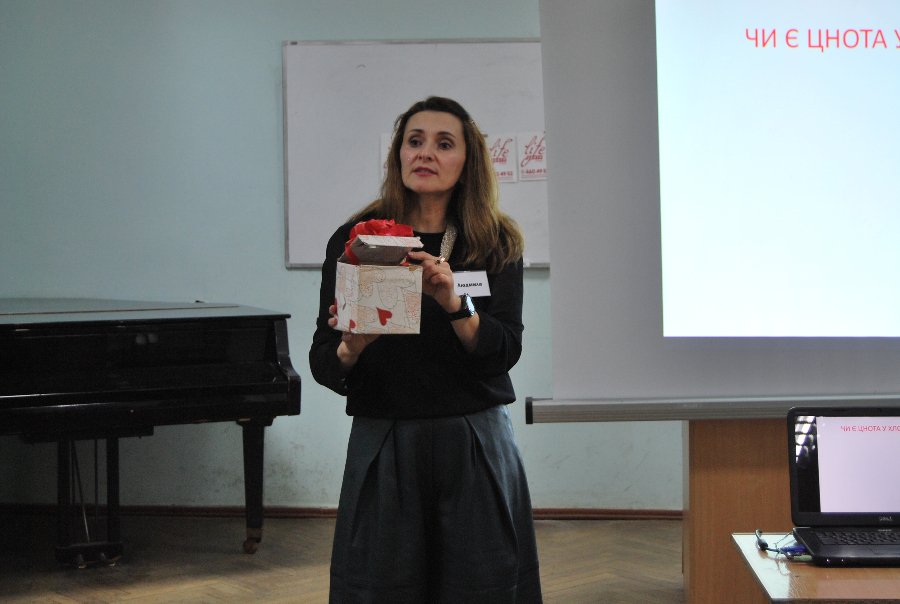 Питання «Чи є цнота у хлопця?» визвало шквал емоцій в аудиторії. І навіть, якщо немає фізичної ознаки незайманості чоловіка, цнотливим вважається той, хто не мав інтимних стосунків ні з жінкою, ні з дівчиною. На прикладі надкушеного яблука і розтріпаної подарункової коробки, волонтер центру продемонструвала, як не приємно отримувати те, чим користувалися до тебе.
