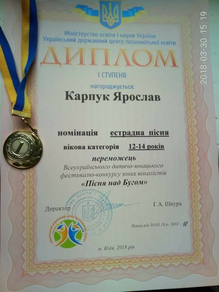 «Наш юний соловейко Ярослав Карпук у Хмельницькому на Всеукраїнському фестивалі «Пісня над Бугом» зайняв перше місце! Вітаємо земляка та бажаємо нових творчих злетів. Старовижівщині є ким гордитися !Молодець!!» – ідеться у дописі.