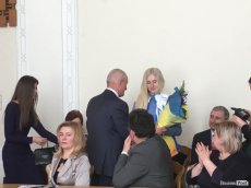 Батенкова-Бауман продемонструвала нагороду, яку вручив їй Президент та подякувала за те, що їх так тепло зустрічають на Волині.