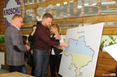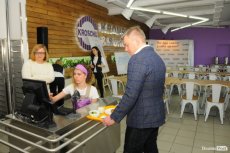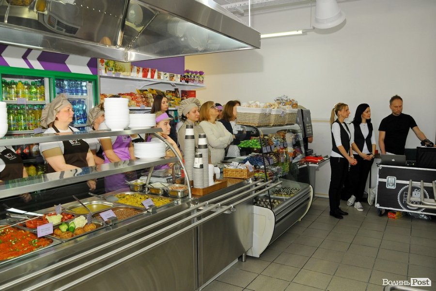 Опісля ж відбулось традиційне перерізання стрічки та акція від організації. Зокрема, усі хто харчуватиметься у їдальні 3 квітня, можуть на мапах України та Німеччини поставити відбиток свого пальця яскравою фарбою. Завершальним етапом презентації оновленої їдальні стала дегустація страв, які тут приготували.