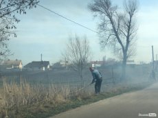 Вогонь вітром перекинуло через дорогу. Гасити займання взявся місцевий мешканець. Подивитись на пожежу зібралась купа дітлахів.