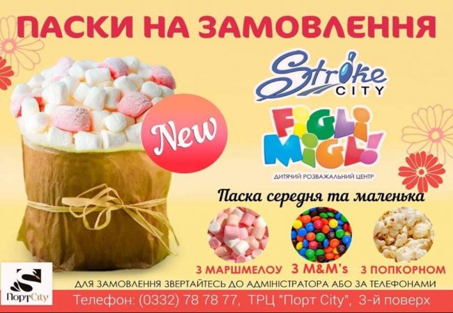 Дитячий розважальний центр «FigliMigli» має унікальну пропозицію до Великодня. Для малюків пропонують паски з попкорном, шоколадом та іншими смаколиками.