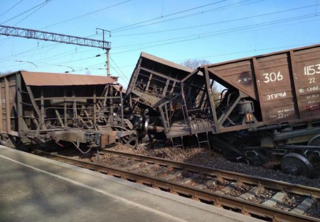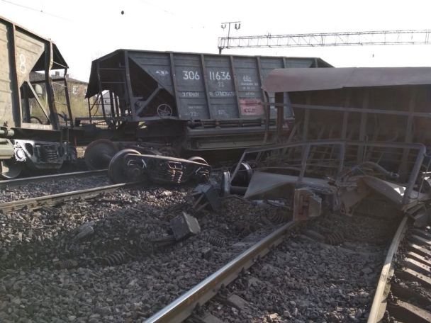 Зазначається, що перекинуті вагони заблокували рух трьома коліями, потяги можуть проїхати лише однією колією.