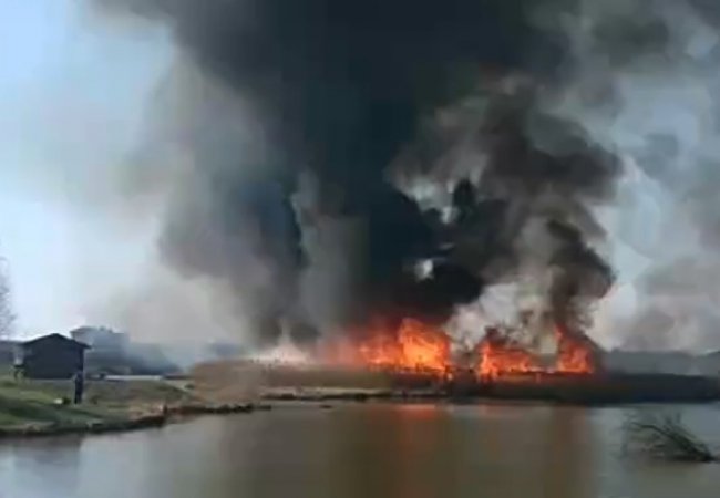 На відео, яке 10 квітня опублікували в Facebook, зафіксовано сильний вогонь, який охопив суху рослинність посеред водойми.
