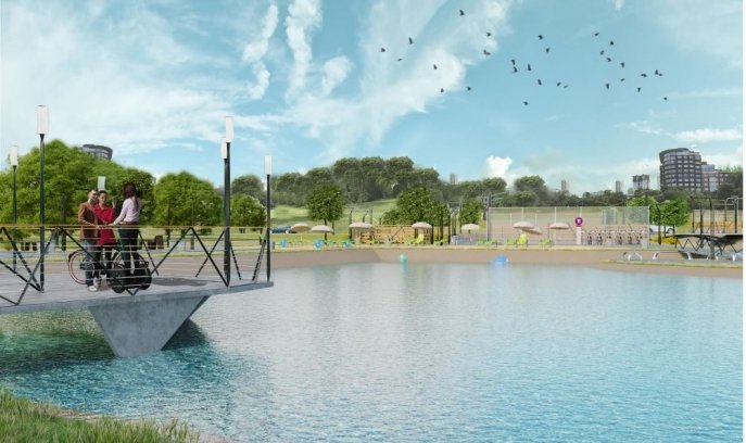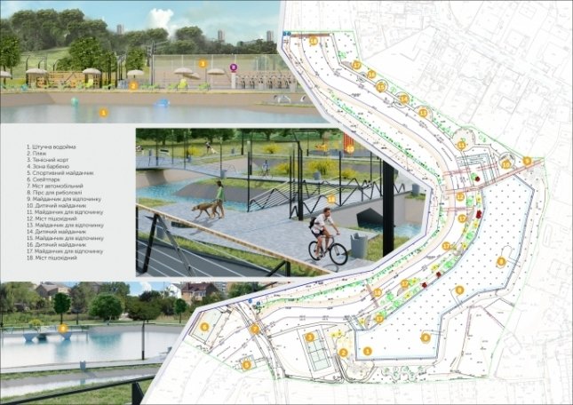 У цю зону будуть входити різні відпочинкові майданчики (дитячі, спортивні), скейт-парк, пірси, пляжна зона. Облаштують вуличне освітлення та систему шлюзів для регулювання води у ставку.