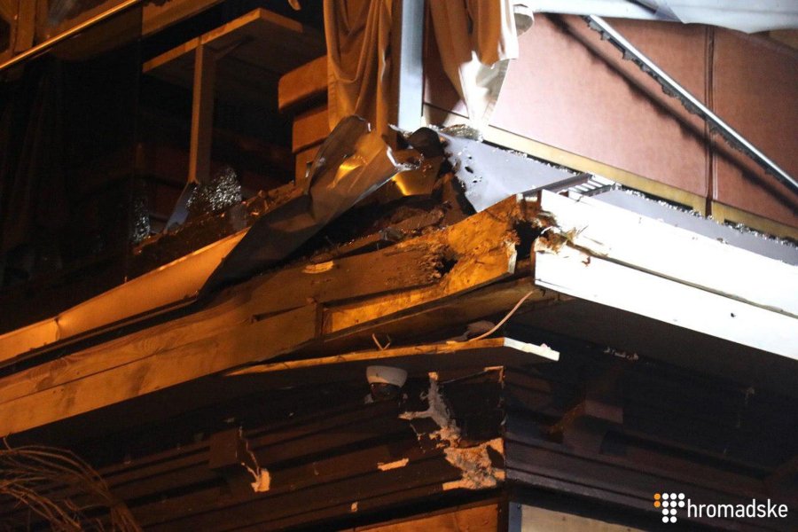 Невідомі поцілили у відділ продажів «Київміськбуду», там, зокрема, виявили хвостовик снаряду. Зазначається, що одразу біля відділу продажів розташований ресторан «Хмелі-сунелі», бокова частина якого також пошкоджена пострілом.