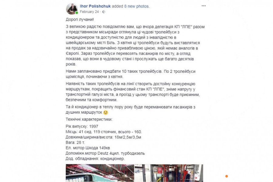 Нагадаємо, що раніше український блогер Денис П'ятигорець розкритикував і роз'яснив «схему» закупівлі швейцарських тролейбусів. Як стало відомо, «Суспільна транспортна компанія» міста Біль у Швейцарії ще в 2016 році заявила про намір замінити 10 тролейбусів 1997 року випуску на нові через те, що в 2018 році в них збігає строк експлуатації.