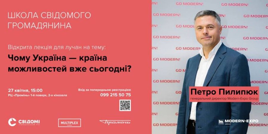 У рамках проекту «Школа свідомого громадянина», організованого громадянським рухом «Cвідомі», у розважальному центрі «Промінь» 27 квітня із публічною лекцією виступить генеральний директор Modern-Expo Group Петро Пилипюк.