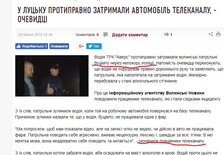 Щодо заголовка про «протиправне затримання автомобіля телеканалу», то інформуємо, що транспортний засіб ніхто не затримував, а зупиняв – і це різні речі, і професійні журналісти мали б це розуміти. Затримали згодом водія, який рухався з порушення правил доржнього руху, складено відповідний протокол затримання.