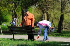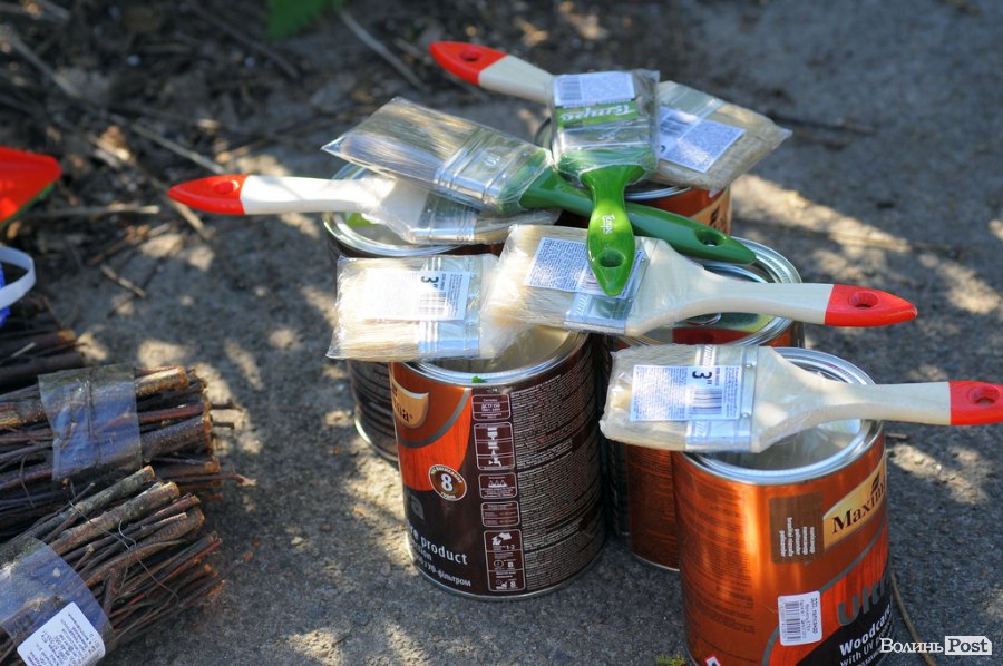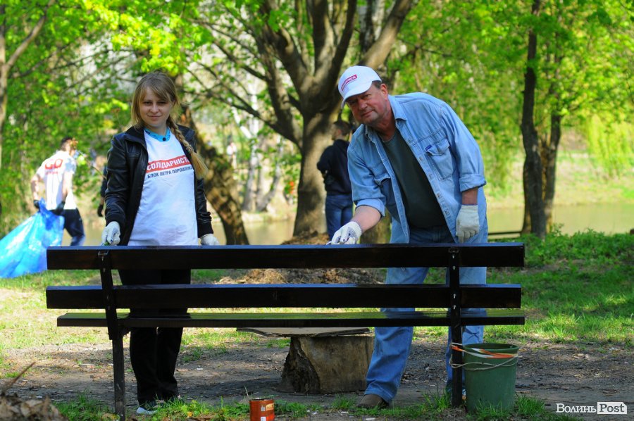 Зранку дехто тут ділить рукавиці та інвентар, а хтось вже активно включився в роботу. Подружжя Байда злагоджено фарбує одну із лавочок парку. Журналістам вони посміхаються і кажуть, що звикли все робити разом.
