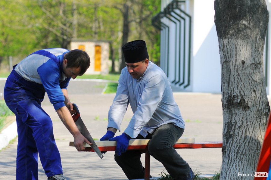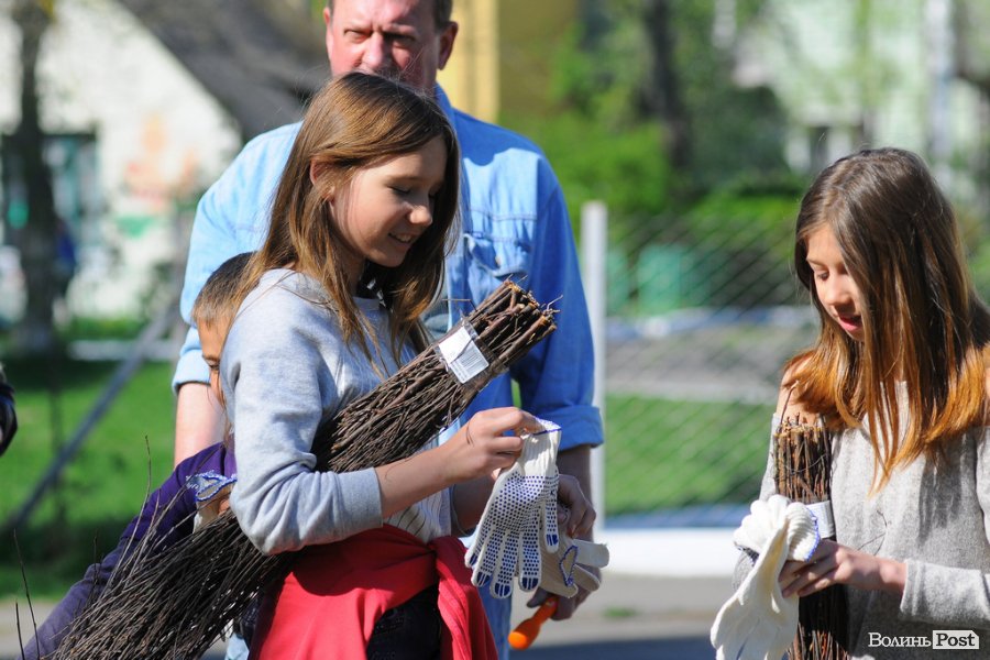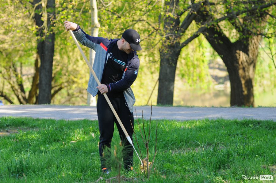 Поруч із ними від минулорічного листя газони прибирає депутат Луцької міськради Петро Нестерук. Тут його виборчий округ, і мешкає він неподалік. На весняну толоку чоловік прийшов разом із сином, та організував це кількадесят мешканців міста, закупивши для толоки фарбу та інвентар.