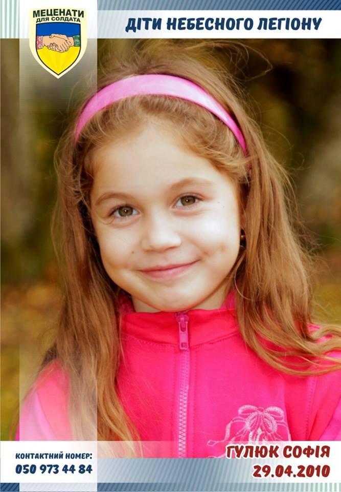 Витончена та ніжна маленька красунечка Софійка Гулюк є нашою черговою квітневою іменинницею серед діток Небесного Легіону. Вона є донькою Гулюка Сергія Миколайовича – молодшого сержанта Луцького прикордонного загону Державної прикордонної служби України, який трагічно загинув 31 липня 2014 року під час мінометного обстрілу ВІПС «Василівка» (ВПС «Амвросіївка») у районі с. Василівка Амвросіївського р-ну Донецької області, разом зі ще 4-ма прикордонниками. Молода дружина Юлія лишилася одна з трьома малолітніми дітьми на руках, і покластися зі своїми проблемами їй було ні на кого.