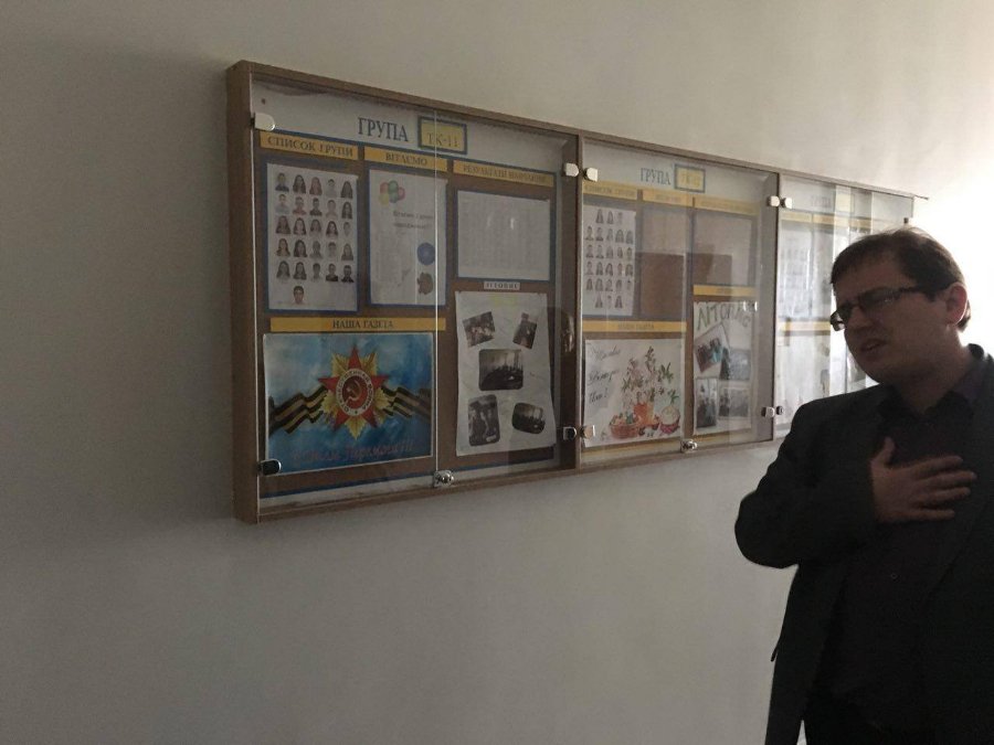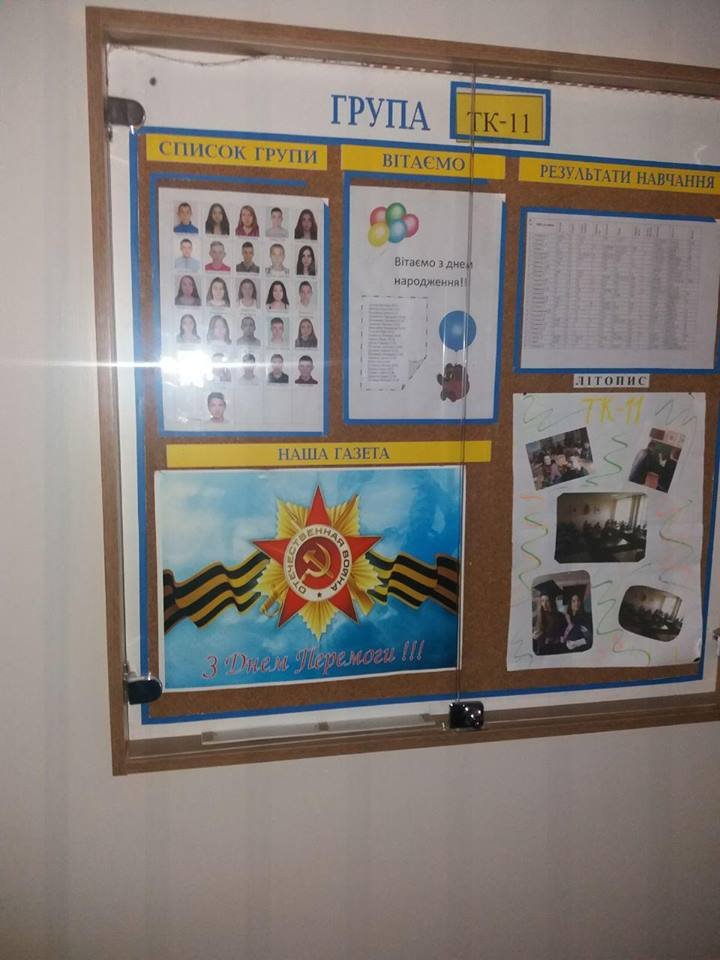 Зазначається, що у вище вказаному навчальному закладі на інформаційному стенді висіла заборонена символіка із зображенням георгіївської стрічки із серпами і молотами.