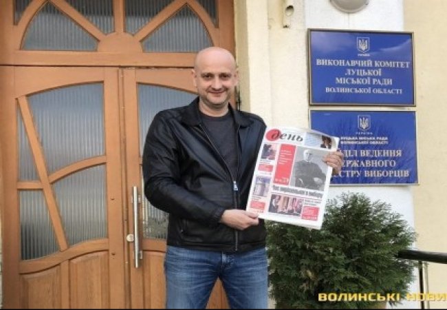 Як доказ свого перебування у Луцьку Євген Ткачук надав фото з сьогоднішнім номером газети "День" біля Луцької міської ради.