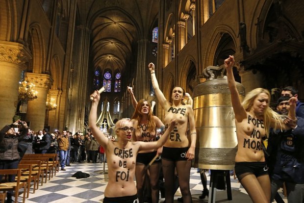 Активістки українського руху Femen провели акцію у Соборі Паризької Богоматері в честь зречення від престолу Папи Римського Бенедикта XVI.