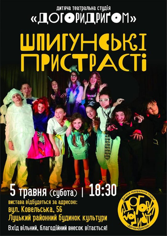 Що обіцяють: Дитяча театральна студія «ДогориДриґом» запрошує переглянути захопливу пригодницьку виставу. Цікаві події розгортаються у двох не дуже дружних королівствах. Чи вдасться королеві Лаковарці разом з її прислужниками вивідати рецепт чарівного мила? Як королева Милослава боротиметься з зазіханнями на її владу? Побачити цю бульбашкову боротьбу ви зможете, якщо завітаєте на «Шпигунські пристрасті»