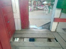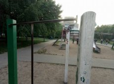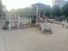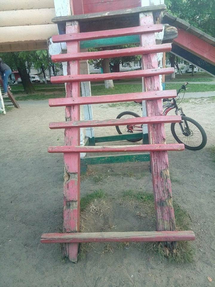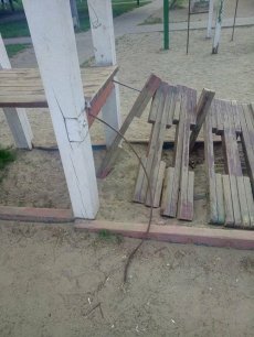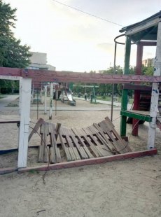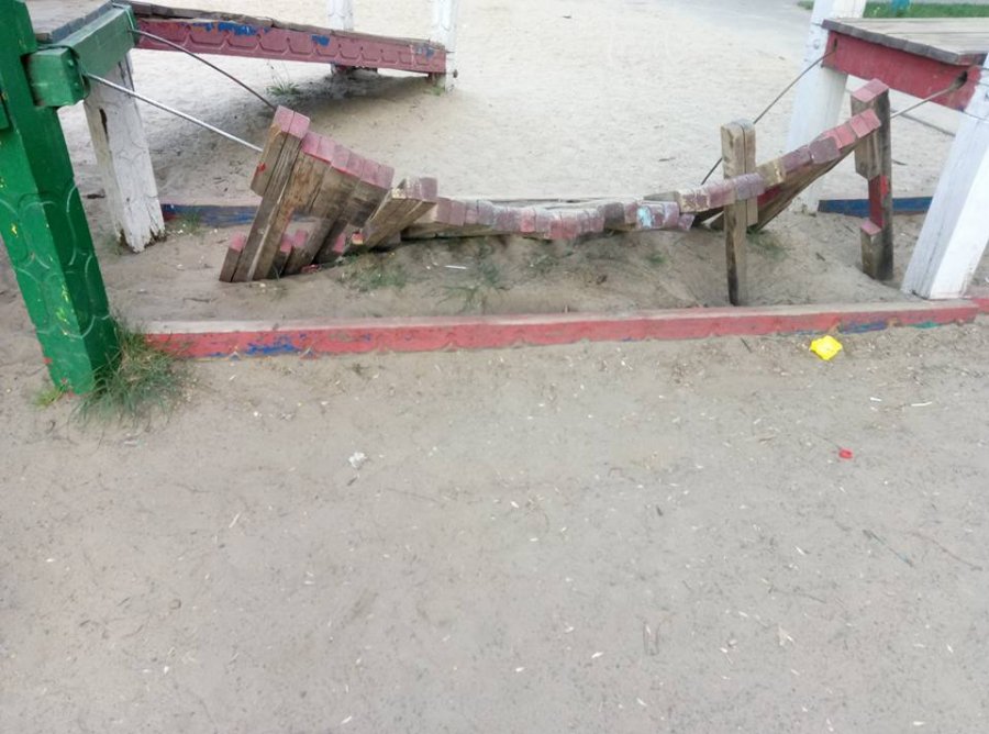 Якщо живете там, то нехай тато візьме разом з іншими татами молоточка, цвяхи та й поремонтує. Почніть кожен з себе...От якби на цьому місці почали зводити будинок, то відразу земля і все що на ній стало б власністю жителів прилеглих будинків, а так нічия....Ми у свому дворі самі наводимо порядок для своїх дітей, це не так складно,...а то привикли шукати винних...