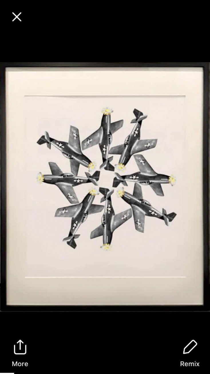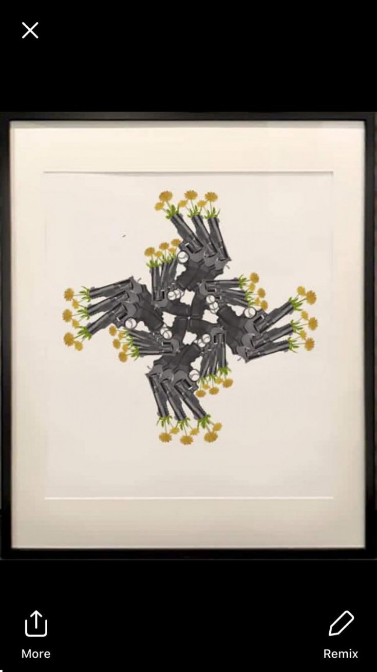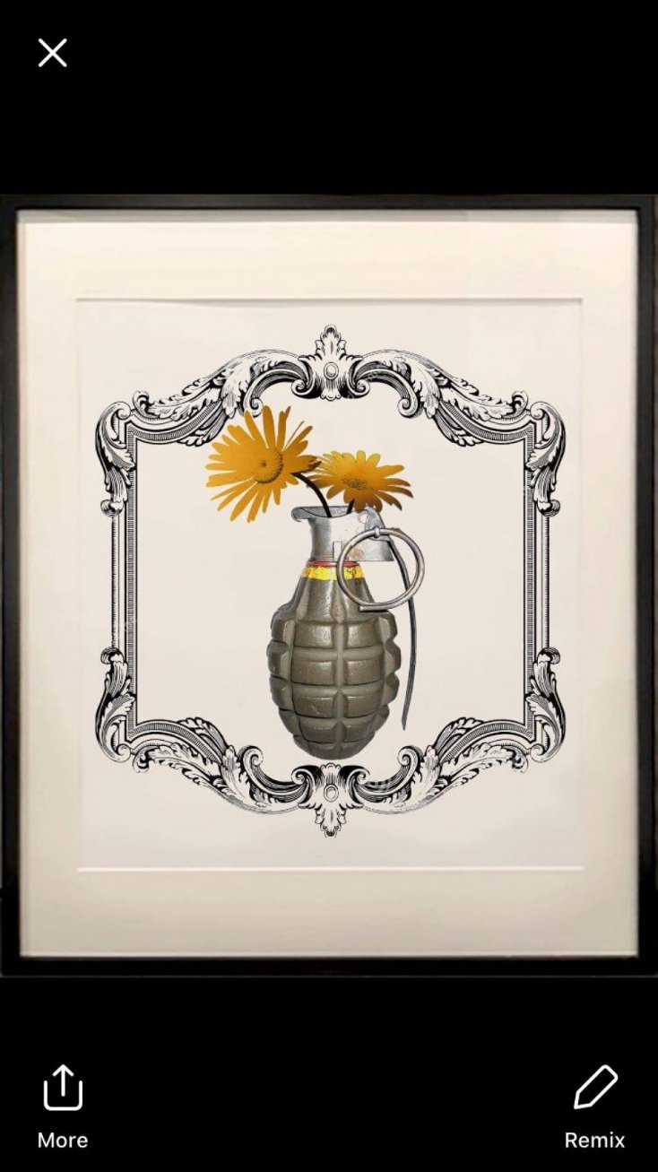 На виставці можна було побачити квіти, що прориваються з дула пістолета, військові літаки з ромашками, бойова граната, більше схожа на квіткову вазу. До такої тематики картин, молоду художницю спонукала війна на сході України.