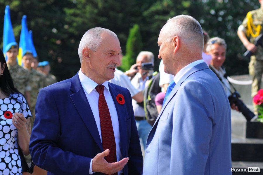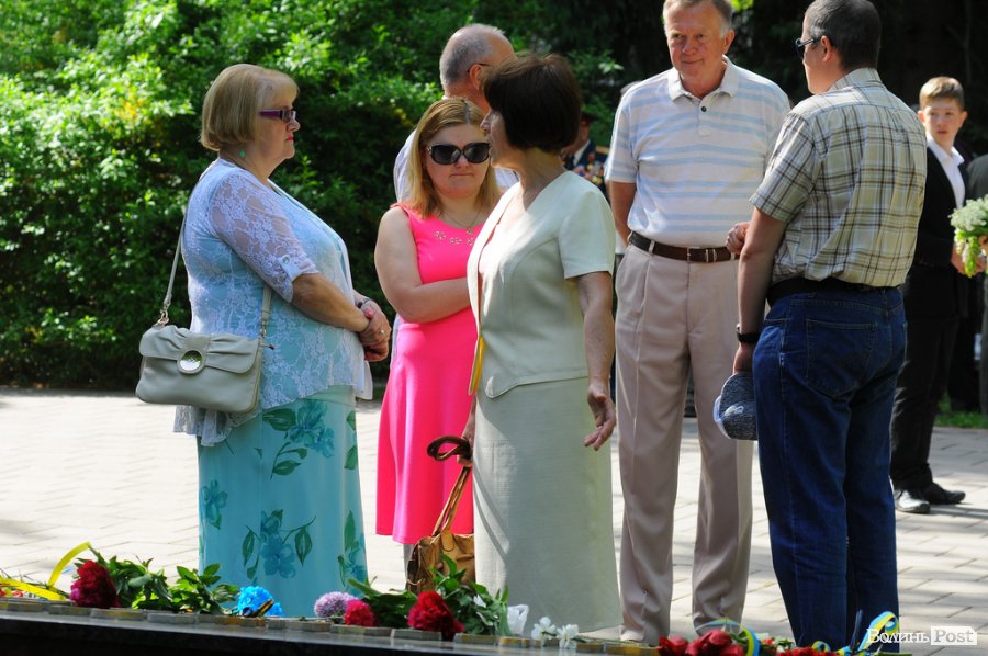 Захід відбувся без промов представників влади, присутні спілкувались між собою, з посадовцями, а потім поклали квіти до пам'ятного знаку.