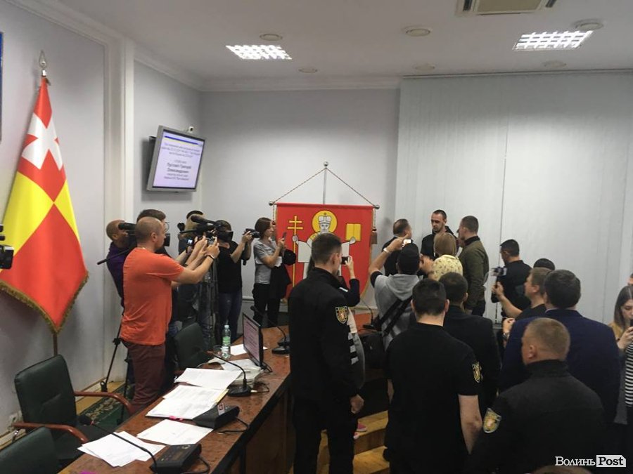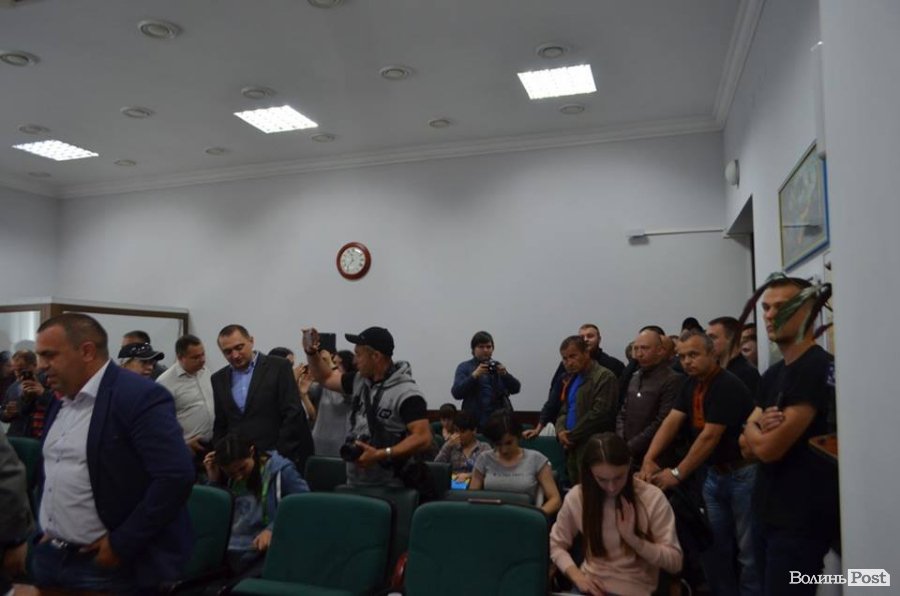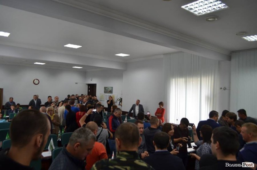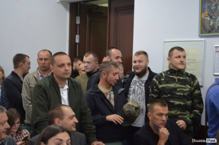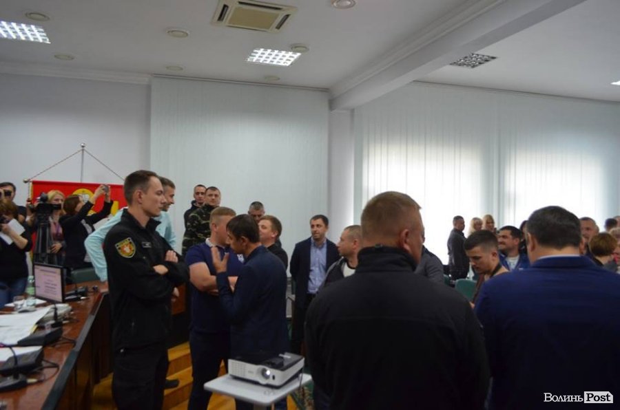 Учасники АТО, які прийшли до міської ради у зв'язку із розглядом питання щодо фінансування Центру реабілітації для бійців, заблокували сесійну залу після оголошення про перерву в засіданні.