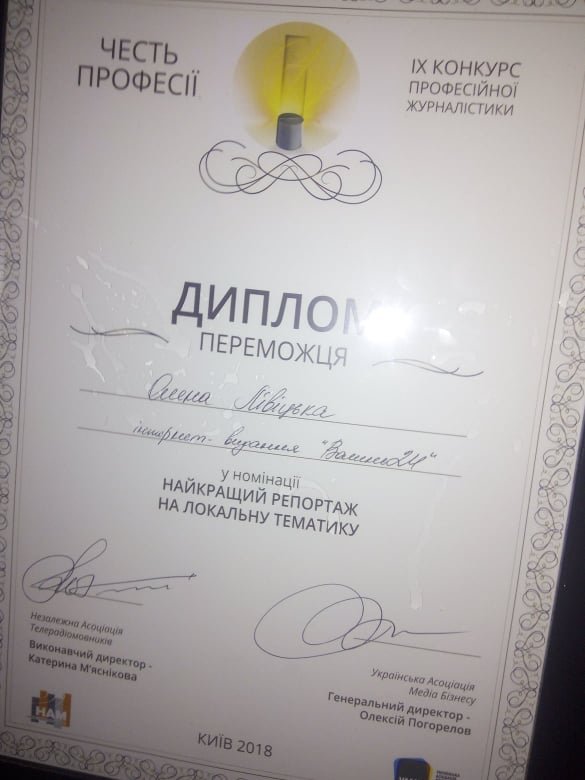 Олена Лівіцька перемогла у номінації «Найкращий репортаж на локальну тематику». Церемонія нагородження переможців конкурсу відбулася у Києві увечері вівторка, 15 травня.