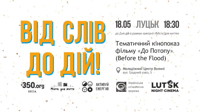 Що обіцяють: Тематичний кінопоказ в рамках глобального кліматичного руху. Відомий документальний фільм «До Потопу» від Леонардо Ді Капріо.