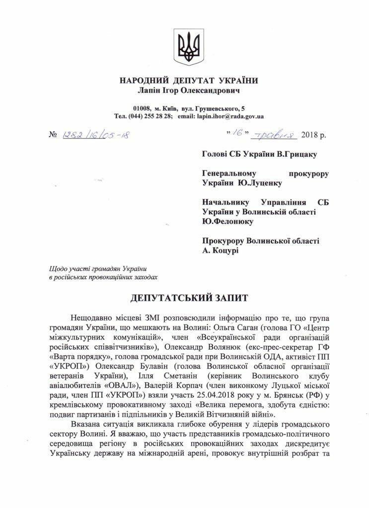 Лапін подав депутатський запит голові СБУ Василю Грицаку, Генпрокурору України Юрію Луценку, начальнику УСБУ у Волинській області Юрію Фелонюку та прокурору Волинської області Андрію Коцурі щодо покарання осіб, які взяли участь у кремлівському заході.