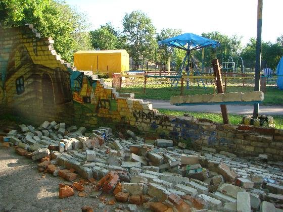 До слова, частина цегляного паркану, яким огороджене містечко, у свій час теж падала. Тоді вдалося залатати дірку тією ж цеглою, яка залишилася непобитою.