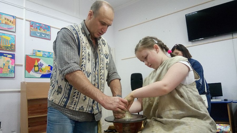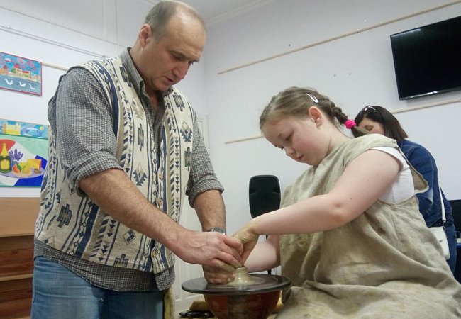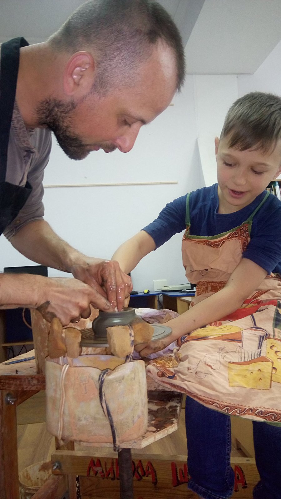 Справжні майстри-чарівники на гончарному крузі перетворювали разом з дітьми грудочку м`якої глини на справжній витвір. Цікаво і пізнавально для присутніх було те, що кожен виготовляв свій власний виріб , звичайно під творчим керівництвом майстрів. Це були глечики, горнятка, метелики, дзвоники, тарілі, вазочки під квіти.