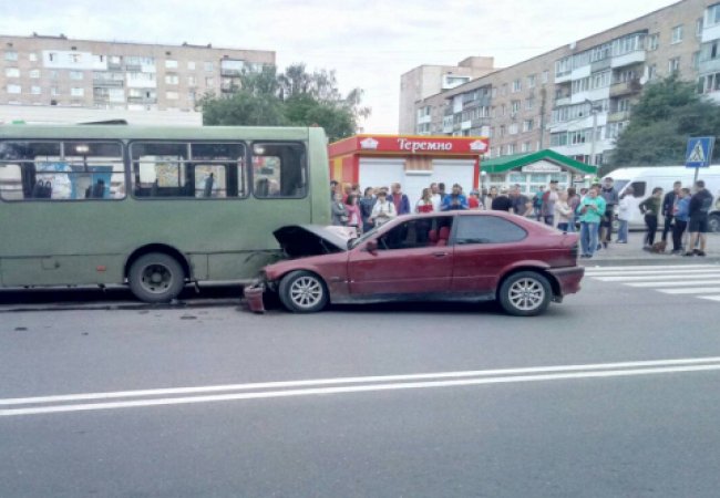 У Луцьку на вулиці Конякіна водій BMW обминав легковик Chery Amulet, який виїхав на зустрічну смугу, та влетів у маршрутку.