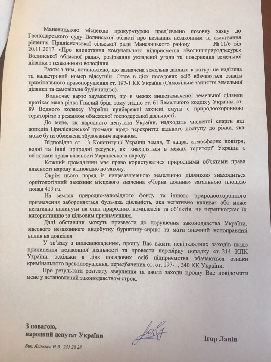 Народний депутат України від Луцька Ігор Лапін звернувся до Генерального прокурора України Юрія Луценка з вимогою вжити невідкладних заходів щодо припинення незаконної, на думку нардепа, діяльності КП «Волиньприродресурс».