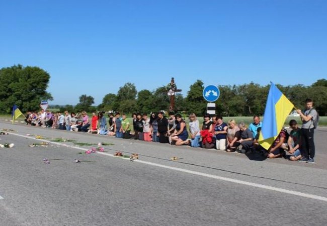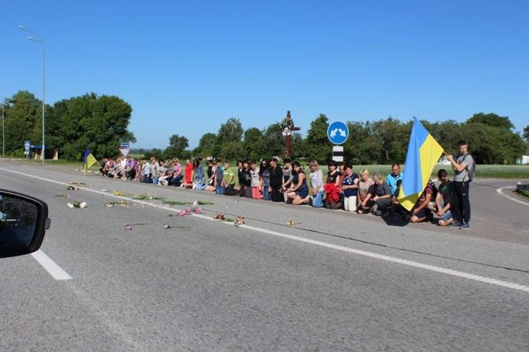 Сотні місцевих мешканців на колінах зустріли колону авто з тілом бійця на межі Дубенського району та у місті Дубно Рівненської області. Дорогу перед авто вистелили квітами та травами.