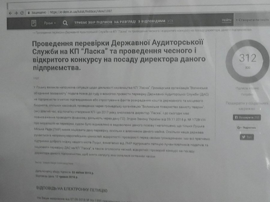 Лучани стоять у сесійній залі із роздрукованими аркушами паперу, де викладено основні тези їхніх вимог. Як розповіли жінки, протестують через те, що на КП «Ласка» неодноразово порушувались правила утримання тварин, відкрито дві кримінальні справи, а попри реєстрацію трьох петицій влада міста не реагує на них, а дає лише відписки.